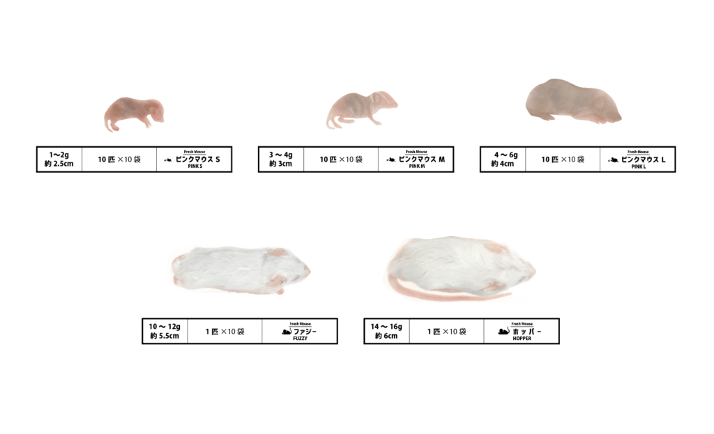 エサの栄養バランスを独自で配合しており徹底的な衛生管理により抗生剤、抗菌剤不使用で飼育しています。また飼育機材を定期的にオートクレーブ(高圧蒸気滅菌)し感染対策しています。健康に育ったマウスやラットを安楽死直後に-40℃で瞬間冷凍することにより鮮度をキープ。 飼育環境もストレスを軽減し清潔に保てる床材コーンコブを採用